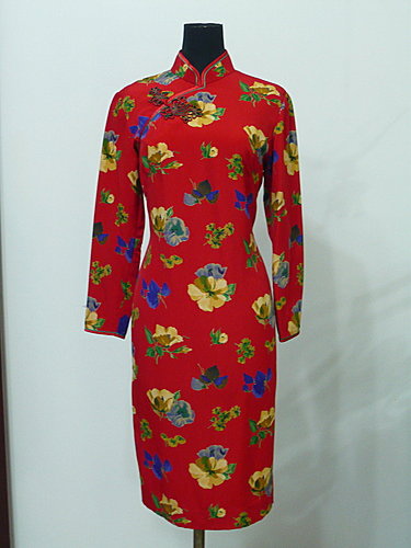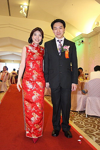 這一對新人ㄚ~~新娘非常可愛,堅持結婚一定要穿緞面大紅色長版無袖式的,所以我們一起在二樓的布店挑選這塊艷紅的料子,也因為她很年輕,所以穿這種顏色顯得非常喜氣,一點都不會太誇張,有些新娘可能會擔心大紅色會不會太誇張,但是這位新娘就是很好的例子喔!!她還把這套旗袍放在她的婚紗照當中,拍的非常復古典雅呢。